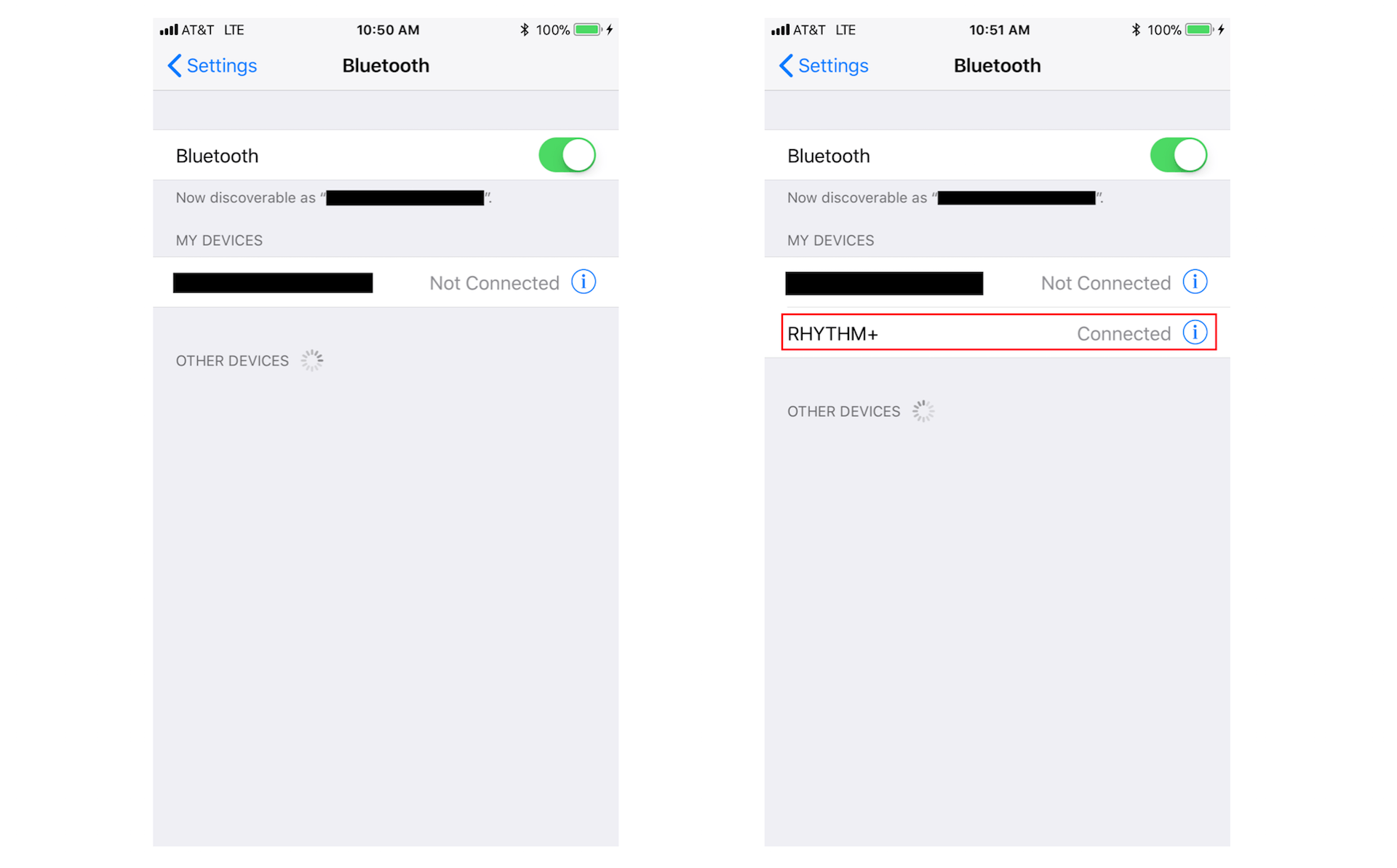 You’ve probably already used iPhone -> Settings -> Bluetooth to turn Bluetooth® (both classic and BLE) off and on. When switched to on, you can watch your iPhone scan for devices and then connect to them, as shown in the following two images where I scanned for, found, and connected my iPhone to a Scosche Rhythm+ HRM: