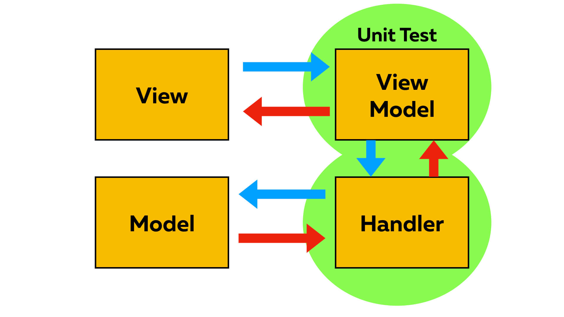 The View will notify its ViewModel to pull data using Handler. After the Handler receives data, it will update the Model. The Model will then eventually be retrieved and updated back to ViewModel and View, which will end the UI update.