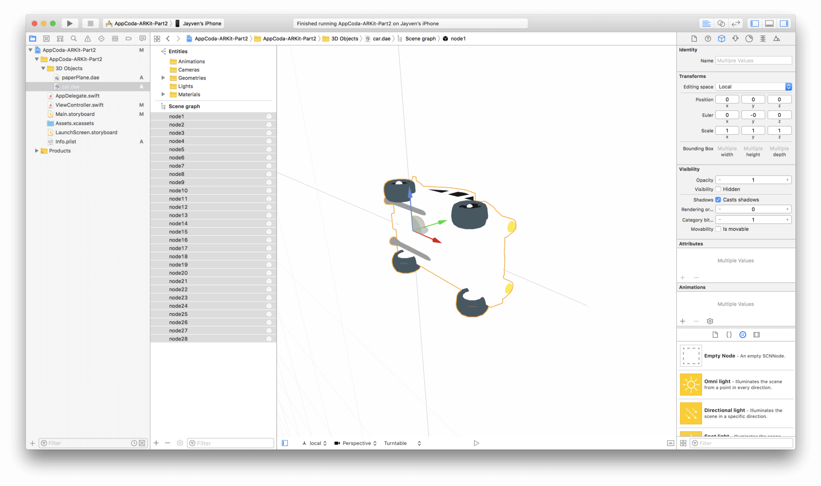 Now some of your 3D model files may contain multiple nodes. In such a scenario, let’s take a look at how we can add a multiple nodes 3D object to our ARSCNView.