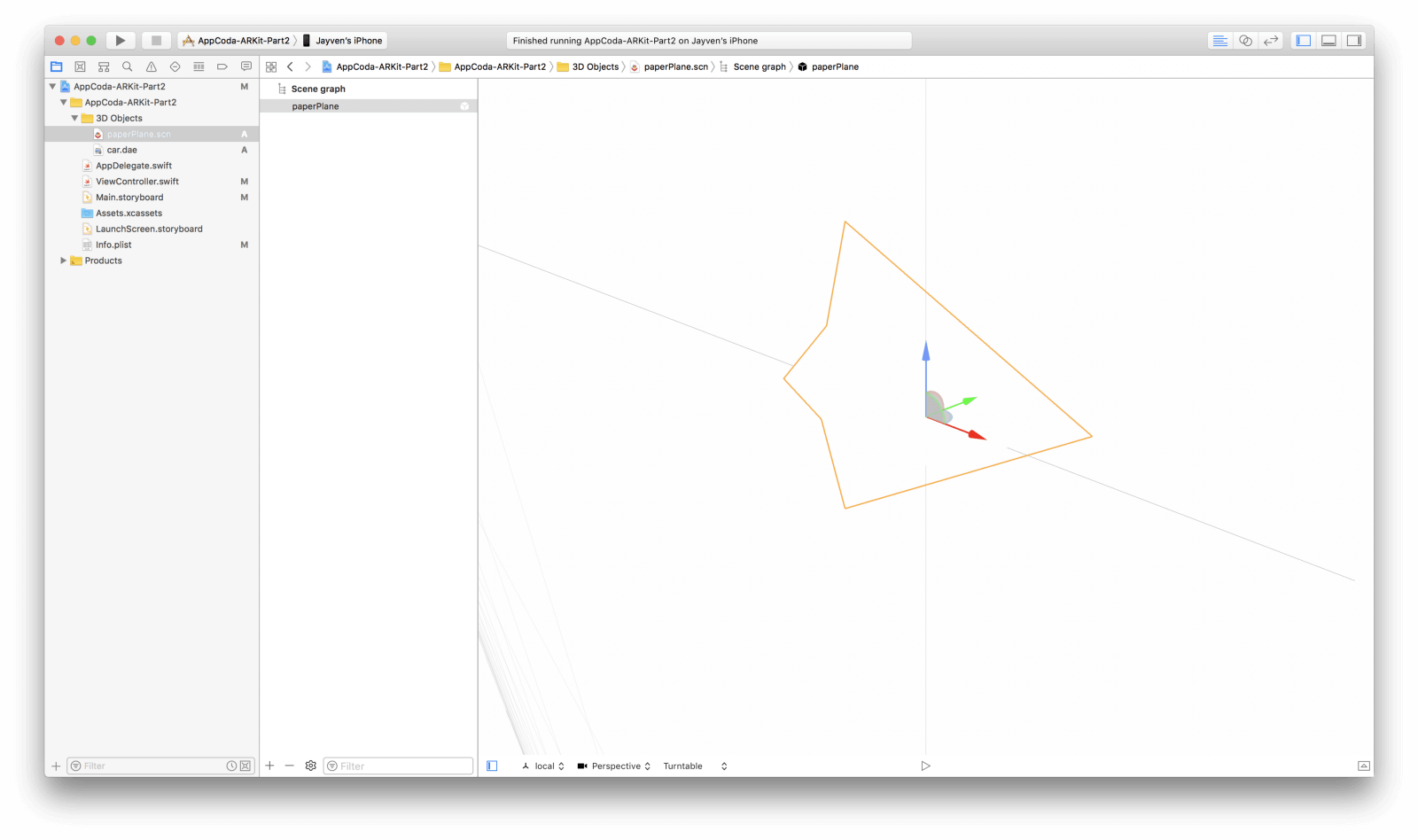 Finally, we add the paperPlaneNode to the rootNode of the sceneView.
