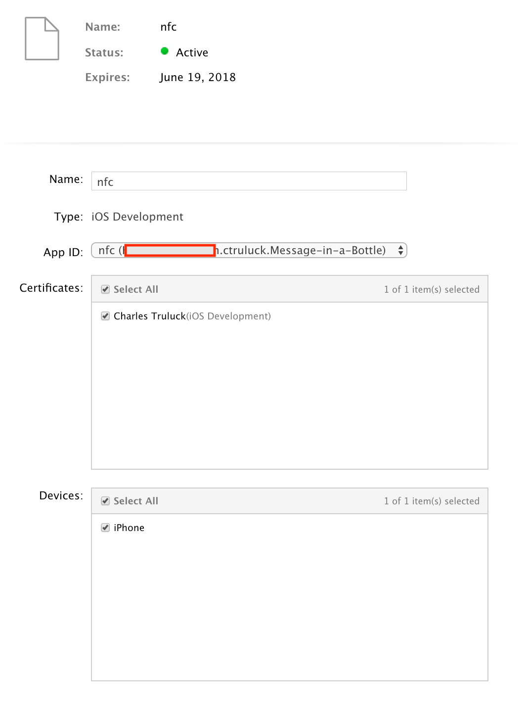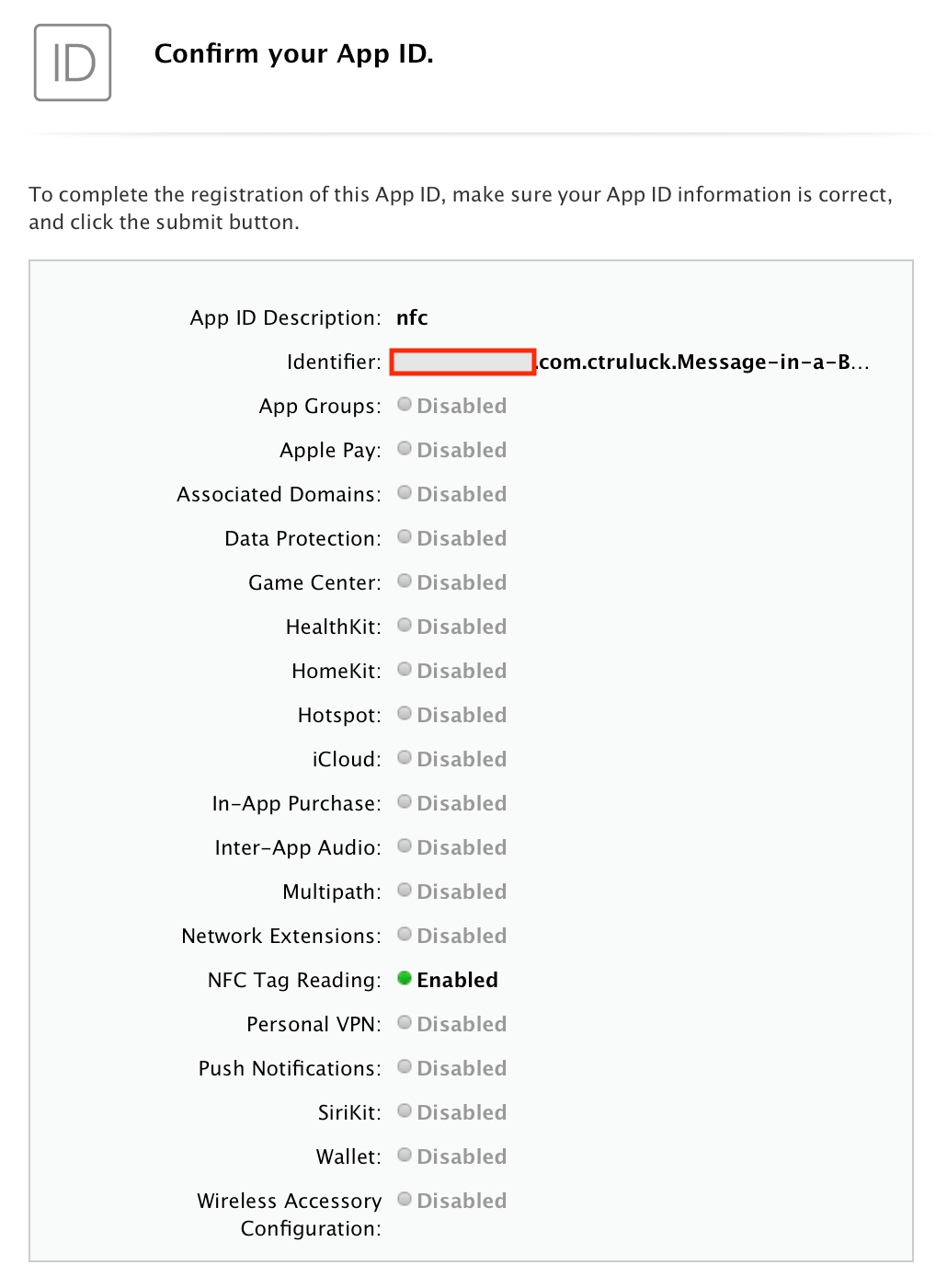 To start, head on over to developer.apple.com. Sign into your account, and once you’re in the Account panel, head to Certificates, Identifiers & Profiles tab. Under Identifiers, click App IDs. Then, click the (+) to register a new App ID. The App ID Description should be simple (i.e. nfc). You Explicit App ID and the Bundle ID must match the Bundle Identifier you used in your Xcode project exactly My Bundle Identifier is com.YOURDOMAIN.Message-in-a-Bottle. Once you’ve put your Bundle Identifier in, scroll down and check NFC Tag Reading in the list of services. Click next and make sure your confirmation page looks similar to mine: