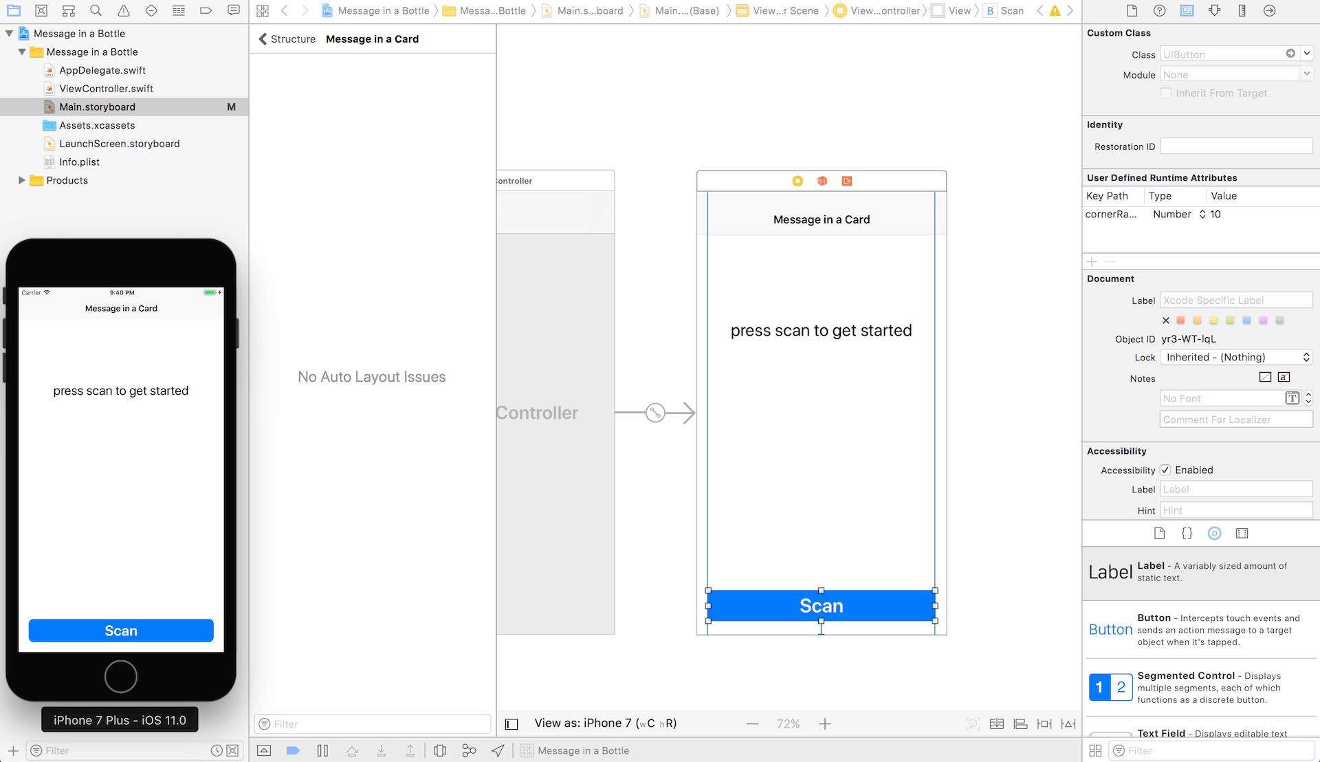 Next, drag in a UIButton and place it at the bottom of the view. Change the button’s text to ‘scan’, and format it as you like. After you add the scan button, let’s also add a UILabel for the scanned message to go and format it as you please. Now our app should look something like this: