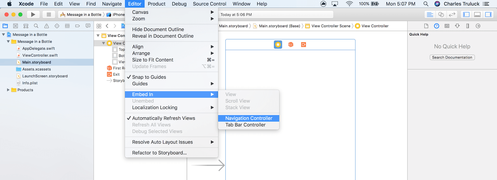 To being, we need to make a user interface (UI) for the user to interact with. Let’s start by creating a navigation controller. Go to Main.storyboard and select the view controller. Then, go to the status bar and click Editor > Embed In > Navigation Controller. This should create a nav bar at the top of your main view. Feel free to customize the title of this nav bar if you see fit. I went with “Message in a Bottle”.