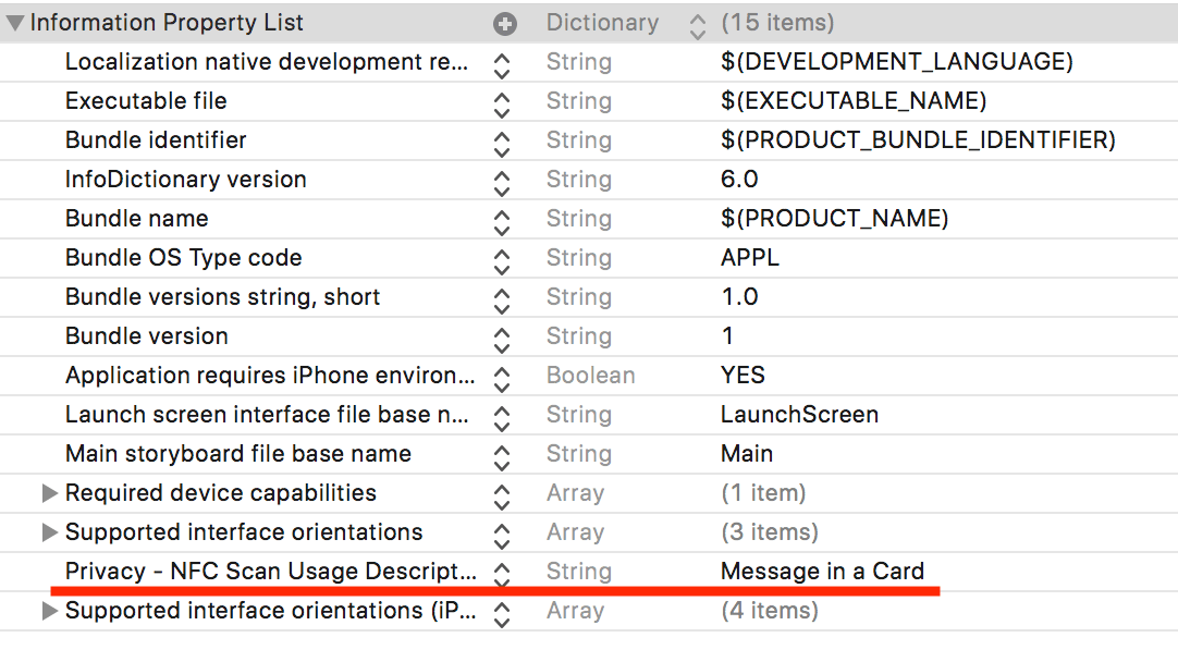Open Info.plist and right click to add a row. In the ‘key’ column, open the dropdown menu and choose Privacy - NFC Scan Usage Description. Set the value to a string of whatever you’d like! This update to our plist file allows our app to access the necessary permissions for NFC.