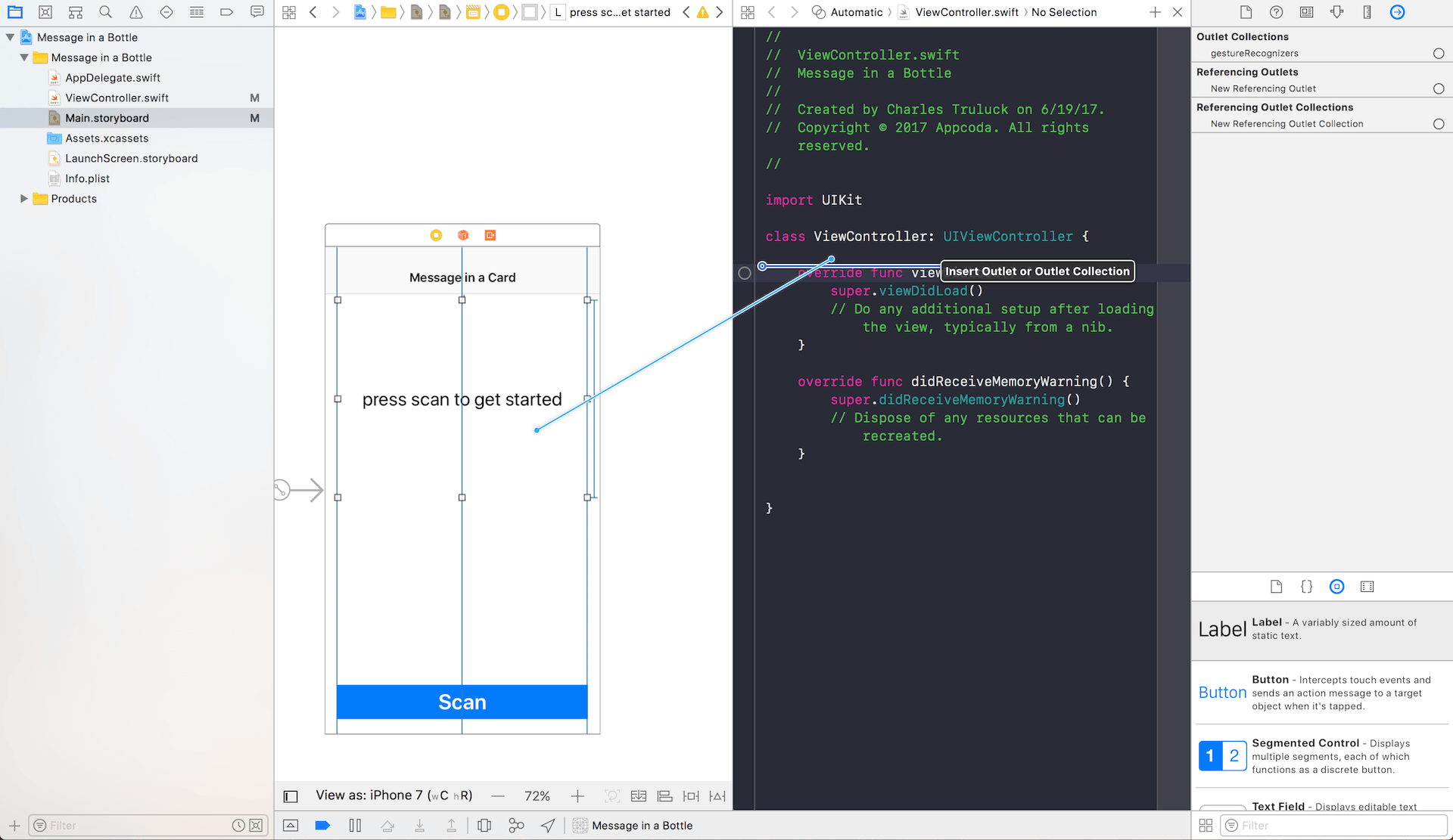 Now that we’ve setup the necessary components of our app, let’s get our hands dirty in code. We will start off with connecting the label and button. Open the assistant-editor (two circles at the top of Xcode) and control-drag from the UILabel to your code to create an outlet.