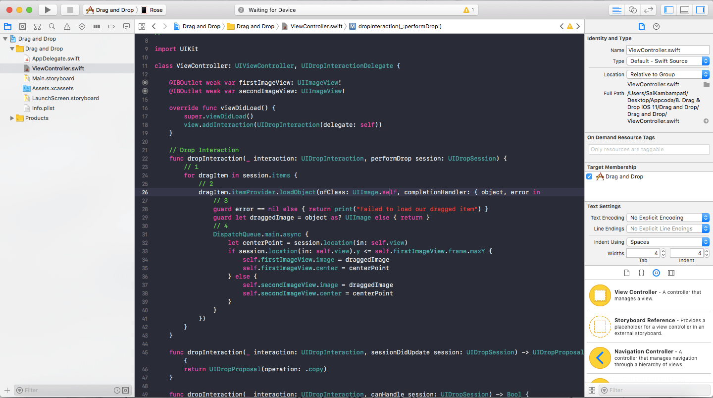 Let’s start with integrating the Dropping APIs. We can now implement the API in several short steps. Our first step is to add the UIDropInteractionDelegate to the ViewController. So adjust the class to look like this: