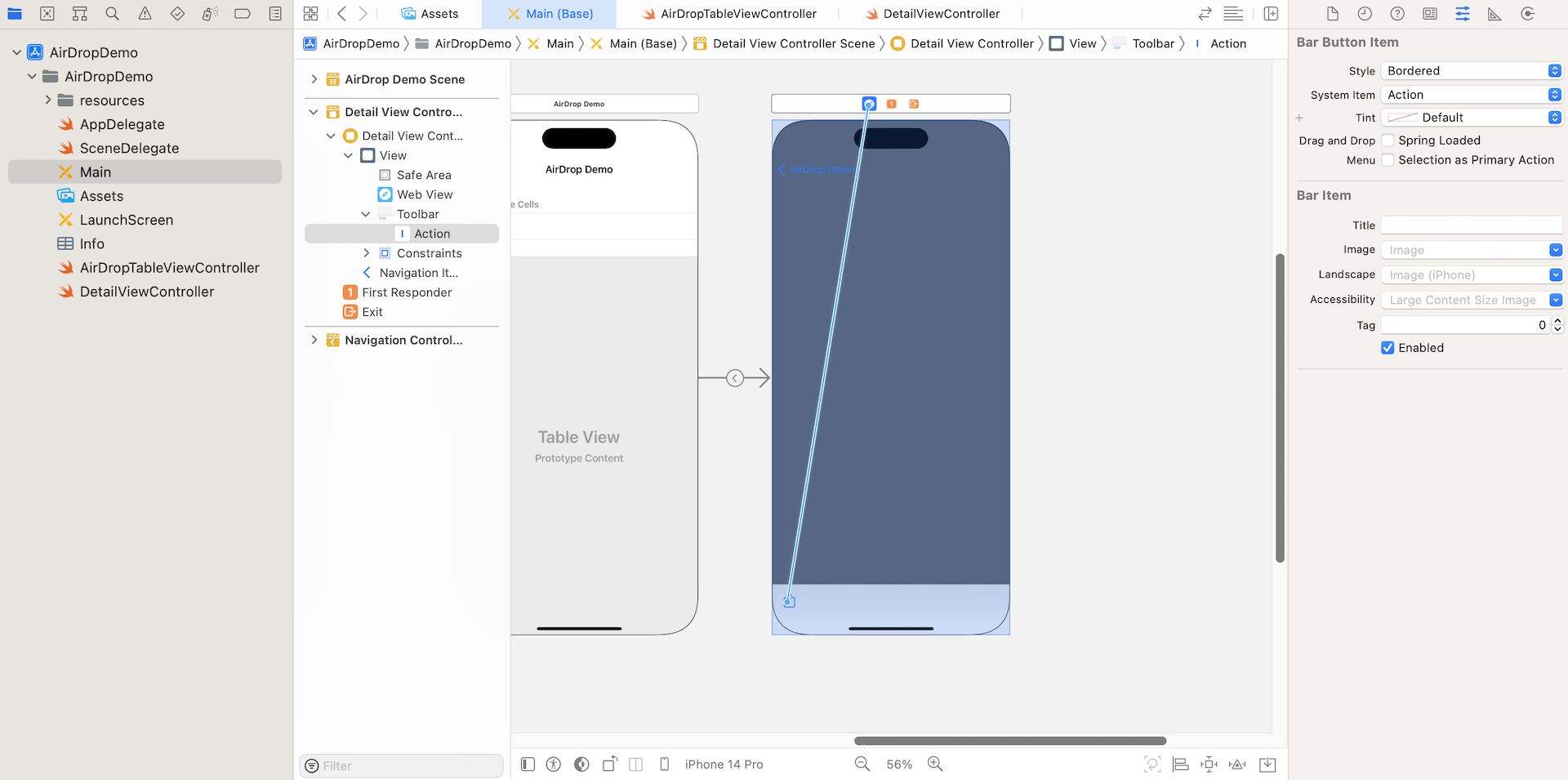The project template already includes the storyboard and the custom classes. The table view controller is associated with AirDropTableViewController, while the detail view controller is connected with DetailViewController. The DetailViewController object simply makes use of WKWebView to display the file content. What we are going to do is add a Share button in the detail view to activate AirDrop.