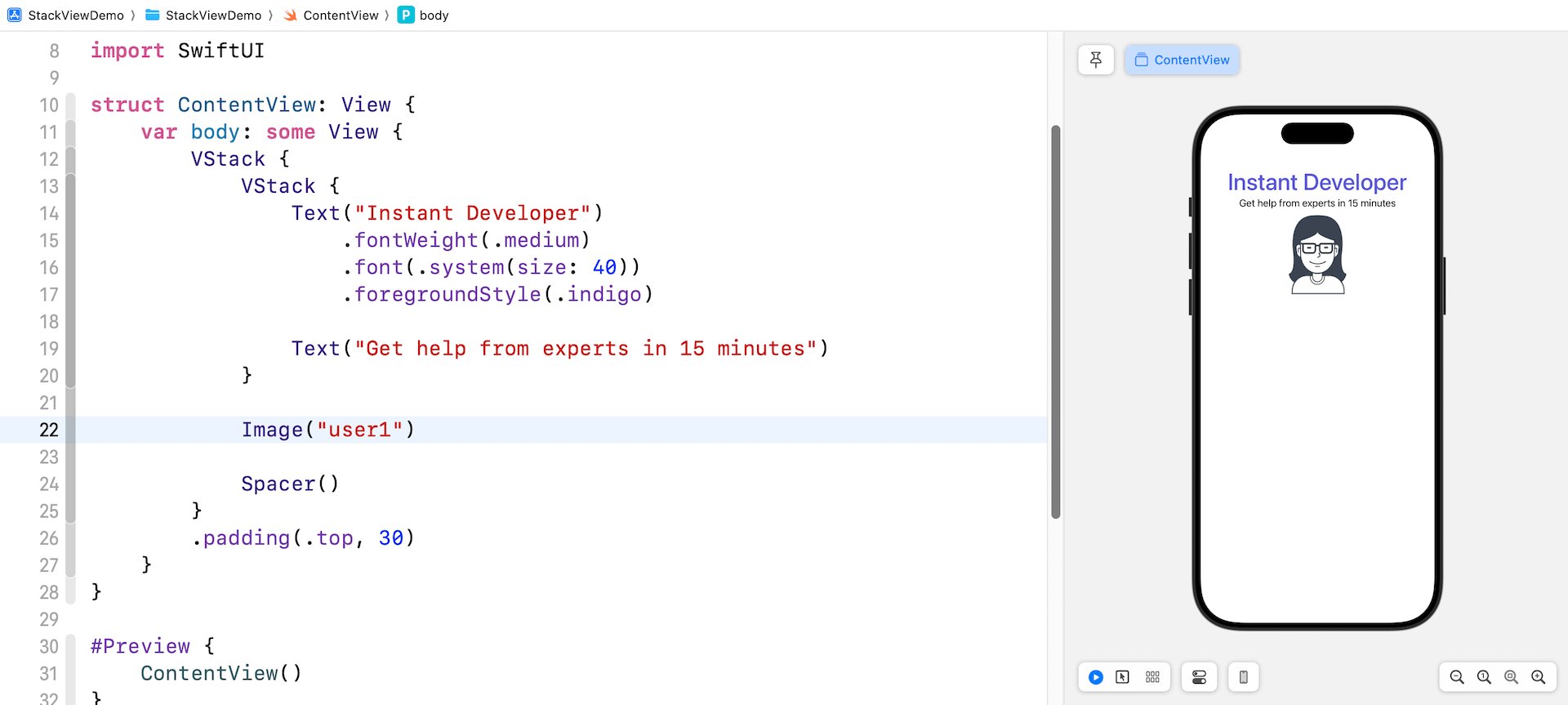 As you can see in the preview, the text views and image views are too close to each other. Similar to HStack, the VStack also accepts a parameter called spacing for you to add some spaces for items in the stack view.