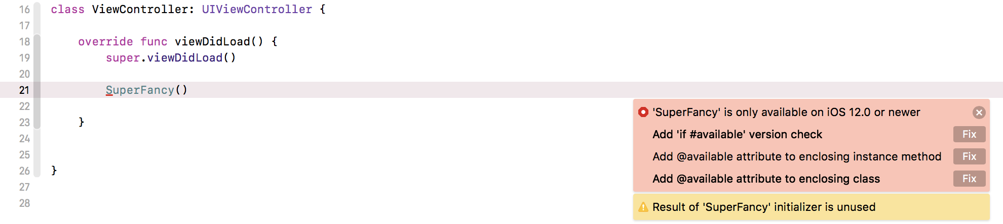 What if you want to develop a class or method, which is available to certain versions of OS? Swift lets you apply the @available attribute on classes/methods/functions to specify the platform and OS version you want to target. Say, for example, you’re developing a class named SuperFancy and it is only available for iOS 12 or later. You can apply @available like this: