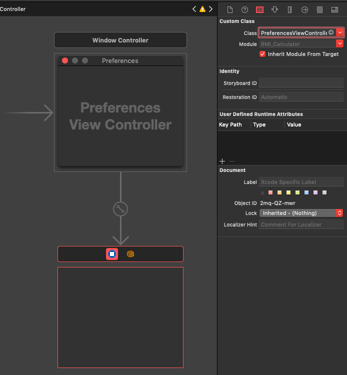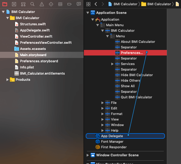 Make sure that the Document Outline is visible, and go to the Application Scene. Start expanding items until you see the Preferences… menu item being listed in the outline (alternatively, click to open BMI Calculator menu in the canvas). Once you spot it, select it and Ctrl + Drag to the App Delegate object down to the Application Scene tree.