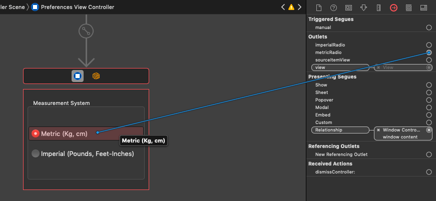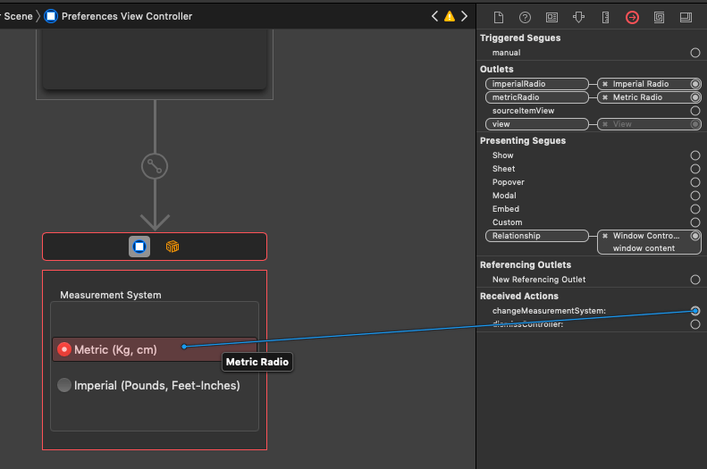 In the PreferencesViewController there are two IBOutlet properties waiting to be connected to the two radio buttons we just added. Select the Preferences View Controller object and open the Connections inspector. Connect the metricRadio outlet to the first radio button, and the imperialRadio to the second.