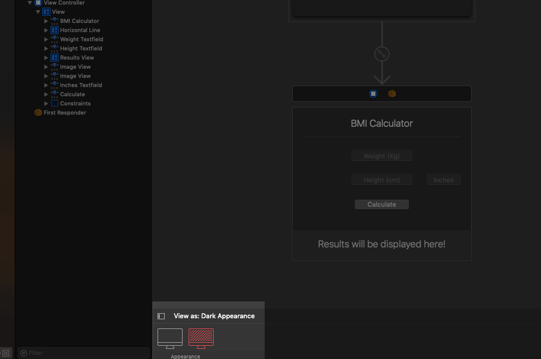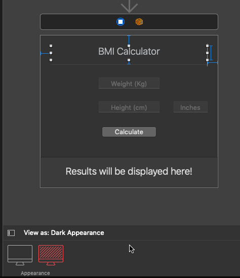 Before we get to that, take a look at the layout bar in Interface Builder at the bottom side of Xcode window. You will find a View as: button. By clicking on it a panel is showing up with two appearance options: Light and dark. When selecting any, the interface in canvas is updated accordingly and we can see instantly how our UI looks like on each theme! At the same time, the View as: button describes in text the selected appearance.
