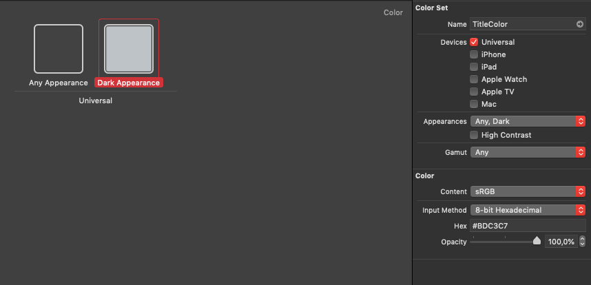 A new color asset will be created and added to the assets catalog. Open the Attributes Inspector in the inspectors panel, and change its name to TitleColor (alternatively, double-click to the color object in the assets lists to rename). A little down there is a popup menu called Appearances. Open it and you will find three options (common for all kind of assets):