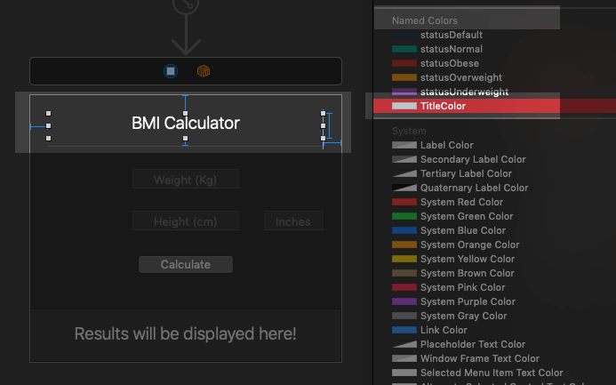 Time to apply and preview that color. Open the Main.storyboard file and click on the “BMI Calculator” label. In the Attributes inspector click to open the Text Color popup menu. In the context menu that will appear, you will find various sections that include the recently used colors, system colors, and a couple more. Right before the system colors you will see a new section called Named Colors. You will find the new color named TitleColor being there! Select it.