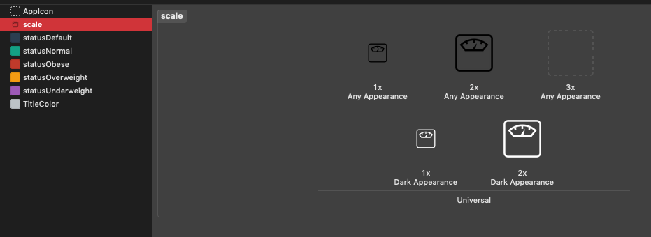 In Finder, find the downloaded images. Drag and drop the scale_black.png to the 1x Any Appearance slot in Xcode, and the [email protected] to the 2x Any Appearance slot. Then do the same for the light images. Drag and drop the scale_white.png to 1x Dark Appearance and the [email protected] to the 2x Dark Appearance slot respectively. At the end you should be having something similar to this: