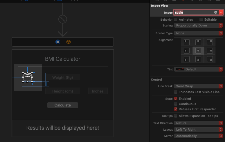 Let’s use these images now. Go back to Main.storyboard file, and select the image view to the left side of the weight text field. In the Attributes inspector go to the Image drop down menu, and either search for the image named scale, or just type it and press Return on the keyboard. The scale image will appear in the image view.