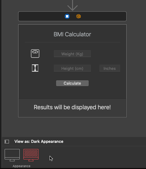 At first, what we are going to change is the text color of the “BMI Calculator” label. That label has its default color at the moment, but we are going to change that and apply a custom color that will vary between dark and light appearance. The same we will do for the images in the two image views to the left side of text fields. To make that specific, what we want to achieve is to have:
