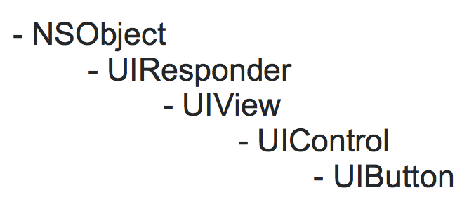 Remember one very important point: Most code in the iOS (and OS X) SDKs comes in the form of class hierarchies. I believe many of the core frameworks we use are still written in Objective-C (and some C++ and C), like Foundation and UIKit. Take the UIButton class found in UIKit. Follow the inheritance tree using the “Inherits From” links found in Apple’s documentation pages from the leaf UIButton up to the root NSObject here: UIButton to UIControl to UIView to UIResponder to NSObject. Visually, it looks like this: