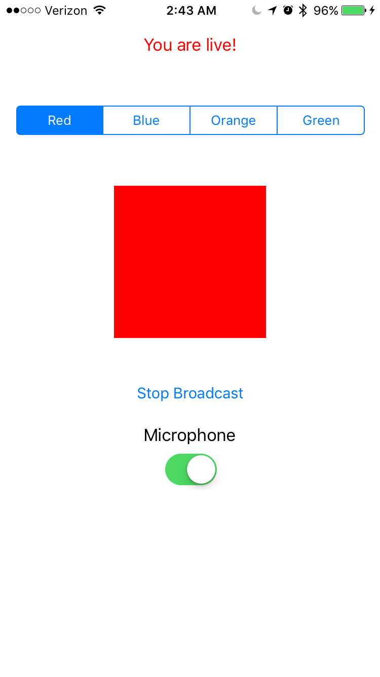 The app we are creating today is actually pretty simple to create. It consists of a status label, a button to start or stop broadcasting, and a switch to toggle the microphone on or off. Similar to the app we made in the screen recording tutorial, it also has a segmented view with a colored square. You can change the colors of the square with the segmented view. We add this so you can do something in the app while your live streaming so you can properly test it.