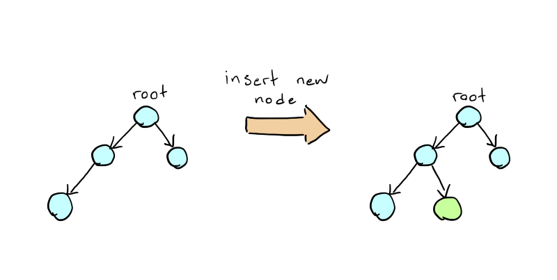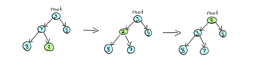 To be able to maintain this property, we’re going to need to do some manipulations to get the correct ordering of nodes. When we insert a new node, we are going to add it to the first available spot from the left in the top level of the tree. If the min heap property does not hold when this is done, we will start swapping the node with its parent until we reach a state where we once again have a min heap. The image below will show you what happens when we insert the number 2 into an already existing min heap: