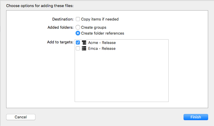 A help bundle is often just a directory containing HTML files/resources. I dragged help folders named “Emca” and “Acme” into the Project Navigator. I was prompted by Xcode both times. I’ll just show you the prompt for the “Acme” folder. Notice I only set the “Acme” folder to be a member of the “Acme – Release” target: