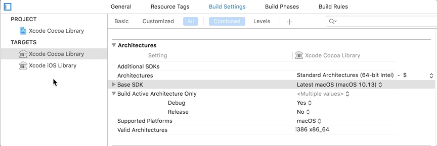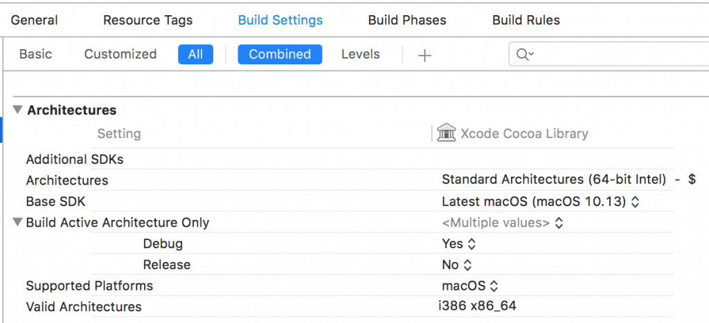 Highlight the “Xcode Cocoa Library” target, go to Build Settings, and look at the Architectures section. You’ll note that the library is configured to be run under macOS on an Intel-based machine: