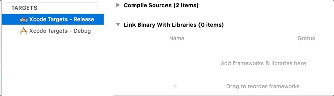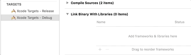 For production, I switch to my “Xcode Targets – Release” target and drag release versions of libraries into Build Phases -> Link Binary With Libraries like this: