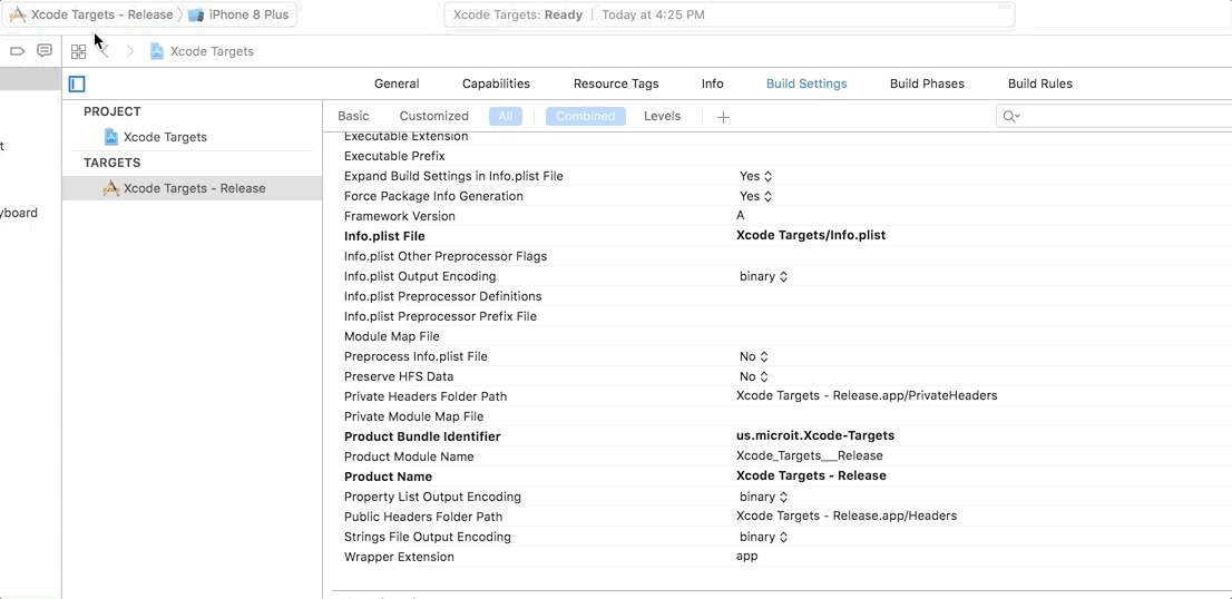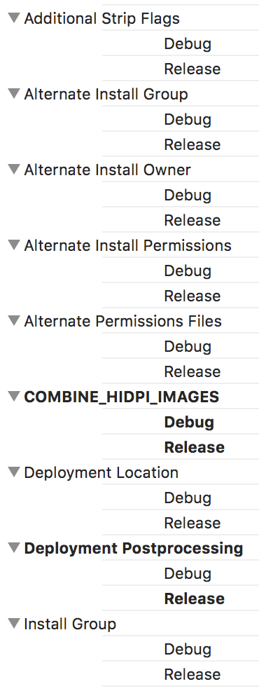 So when faced with debug/release, debug/release, debug/release, debug/release…, I see the opportunity for developers to start unwittingly — and easily — commingling debug and release options, or just plain setting conflicting options. As we’ll soon see, I’d rather keep all my release settings in one target and my debug settings in another.