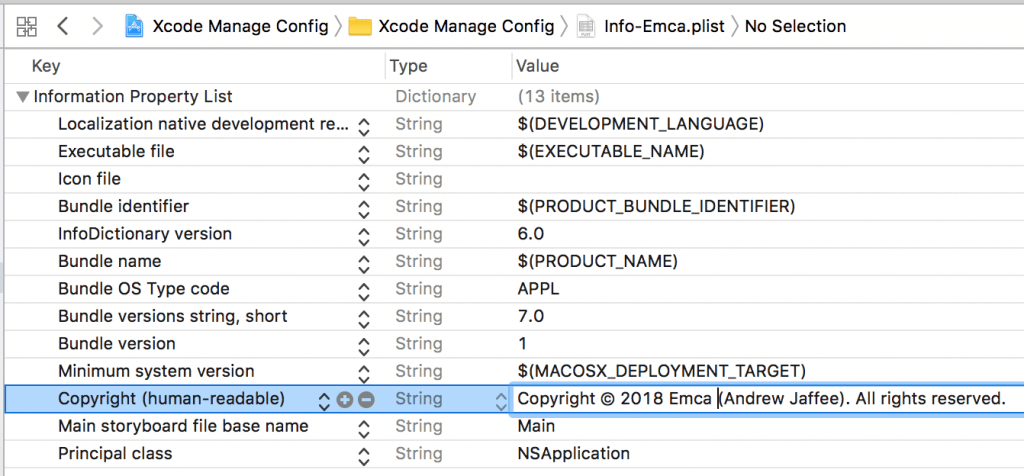 I arranged the Info.plist files for the two targets in this project as I had discussed above in the first sample project. As you’d expect, there’s an Info-Acme.plist for the “Acme – Release” target and an Info-Emca.plist for the “Emca – Release” target. Changing the copyright text is code independent. You highlight the plist file in each target, click into the Copyright (human-readable) string value, and make your edits like so: