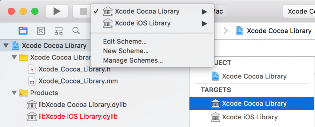 As we did earlier, Duplicate the “Xcode Cocoa Library” target, renaming the new target and associated scheme as “Xcode iOS Library.” At this point, your project should look like so: