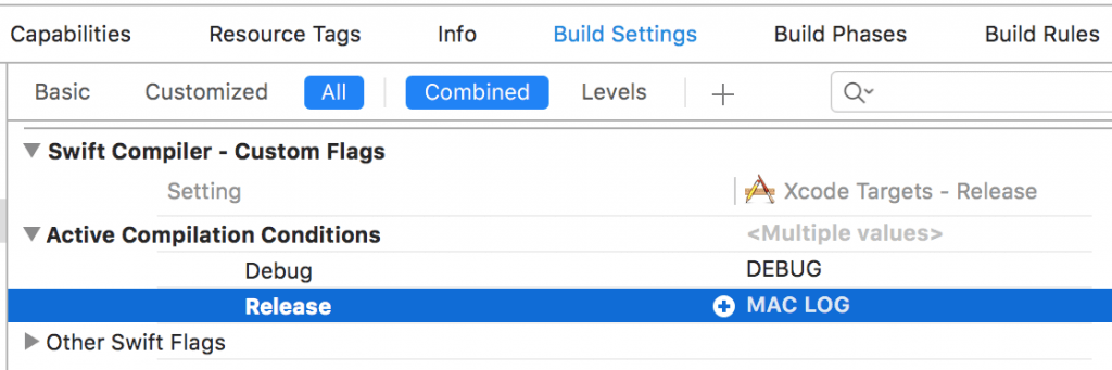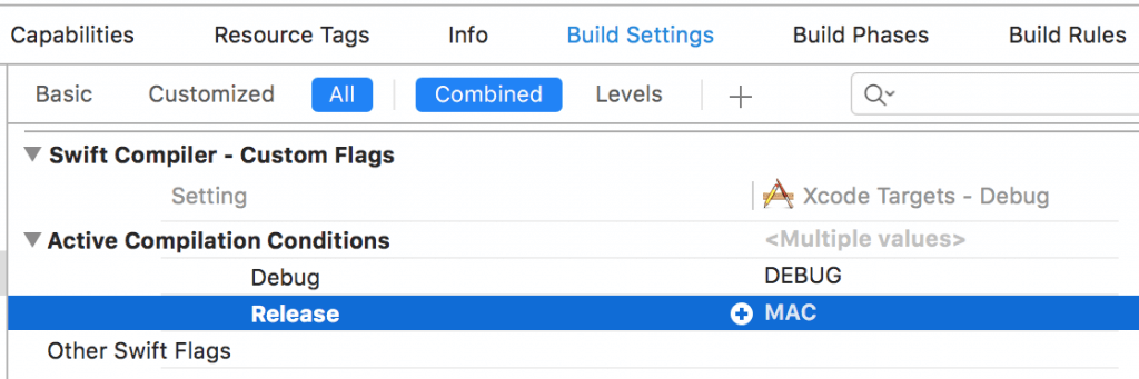 You can use any of the symbols listed in this link, but I’ll talk about using custom symbols here. Swift still respects DEBUG, but if you want to use it, or the language’s built-in symbols, or custom symbols, you have to define them in your Build Settings -> Swift Compiler – Custom Flags -> Active Compilation Conditions now.