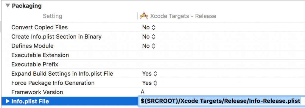 I like to use the $(SRCROOT) macro in my Xcode projects to standardize and organize my file locations. To keep things “Xcodey,” I set my Build Settings for my “Xcode Targets – Release” target’s Info.plist like so: