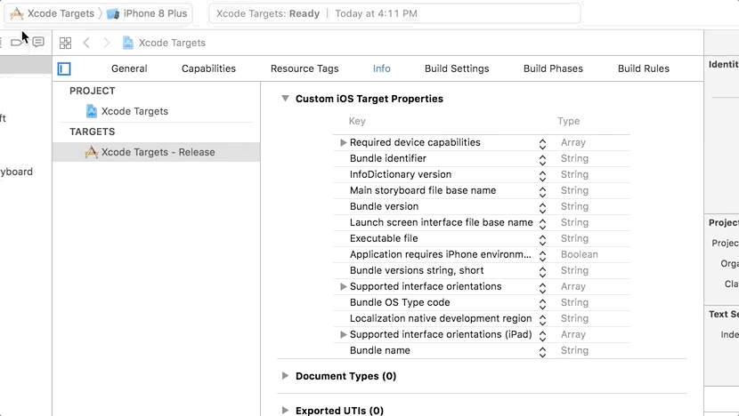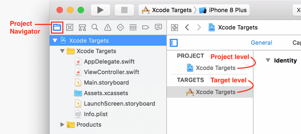 When you create a new project in Xcode, one single target is created for you. For example, I created an Xcode project for iOS, based on the Single View App template, and named it “Xcode Targets.” You can download it from GitHub. Let’s get a quick overview of how project configuration settings/options are stored.